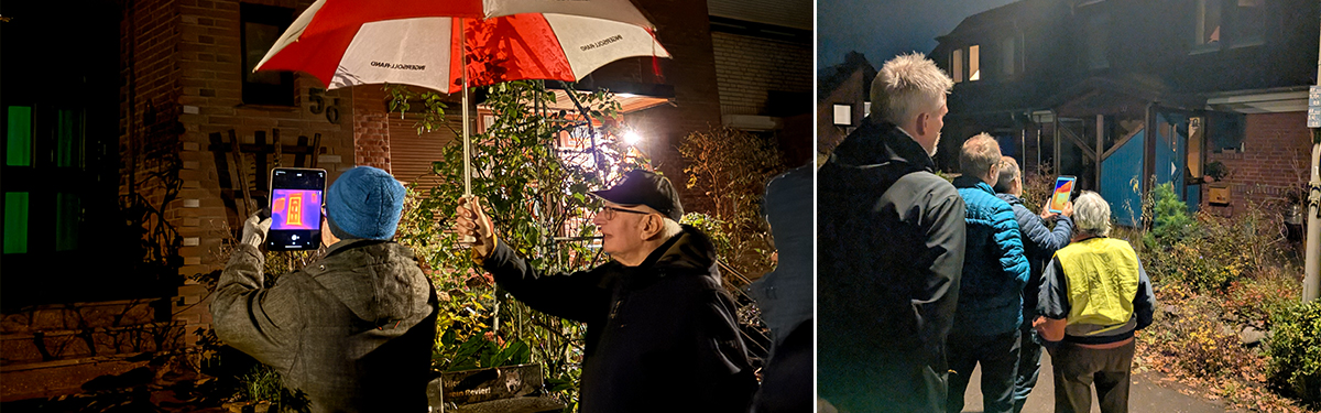 In diesem Winter führt die ZEBAU GmbH fast jede Woche eine Thermo-Tour in Hamburg durch – gestartet sind wir am Tegelsbarg-Müssenredder sowie in Billstedt und Rahlstedt-Ost. Wir lieben dieses interaktive Informationsformat, denn unsere Energieberater:innen können den Eigentümer:innen eindrücklich am eigenen Gebäude mit der Wärmebildkamera Schwachstellen an der Gebäudehülle aufzeigen. Das bleibt im Gedächtnis und motiviert zum Handeln – genauso wie der Austausch in der Nachbarschaft, der bei den Touren mit rund 20-30 Teilnehmenden entsteht.