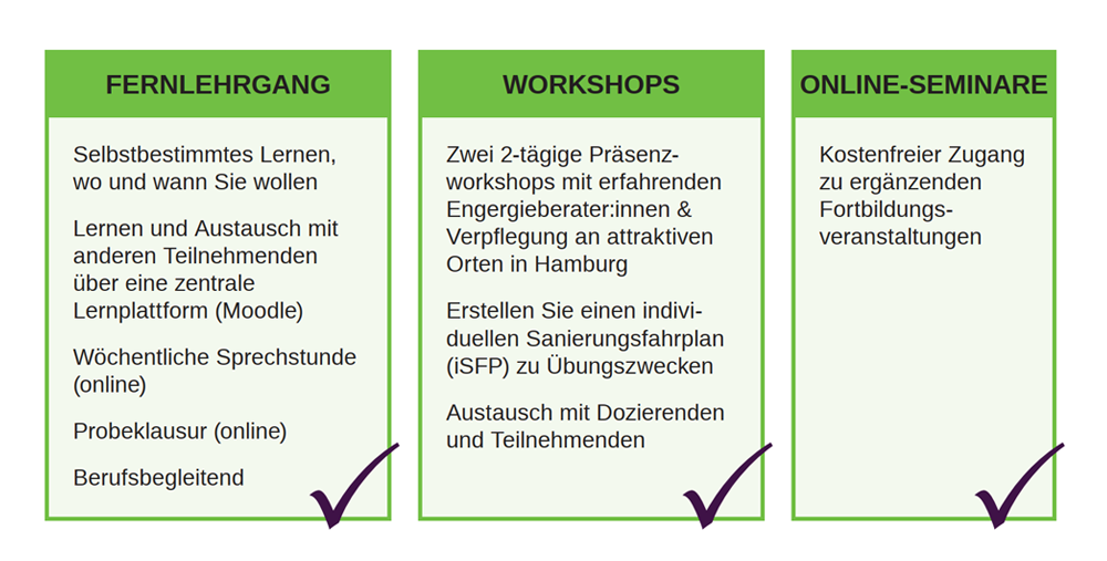 Der Lehrgang erfüllt die Anforderungen an die Inhalte gemäß des aktuellen Regelheftes der Energieeffizienz-Expertenliste: Basis + Vertiefung für Wohngebäude sowie die in Anlage 11 des GEG festgelegten Anforderungen an die Inhalte der Schulung für die Berechtigung zur Ausstellung von Energieausweisen und ist von der Staatlichen Zentralstelle für Fernunterricht (zfu) geprüft und anerkannt (Kursnummer: 7493324).